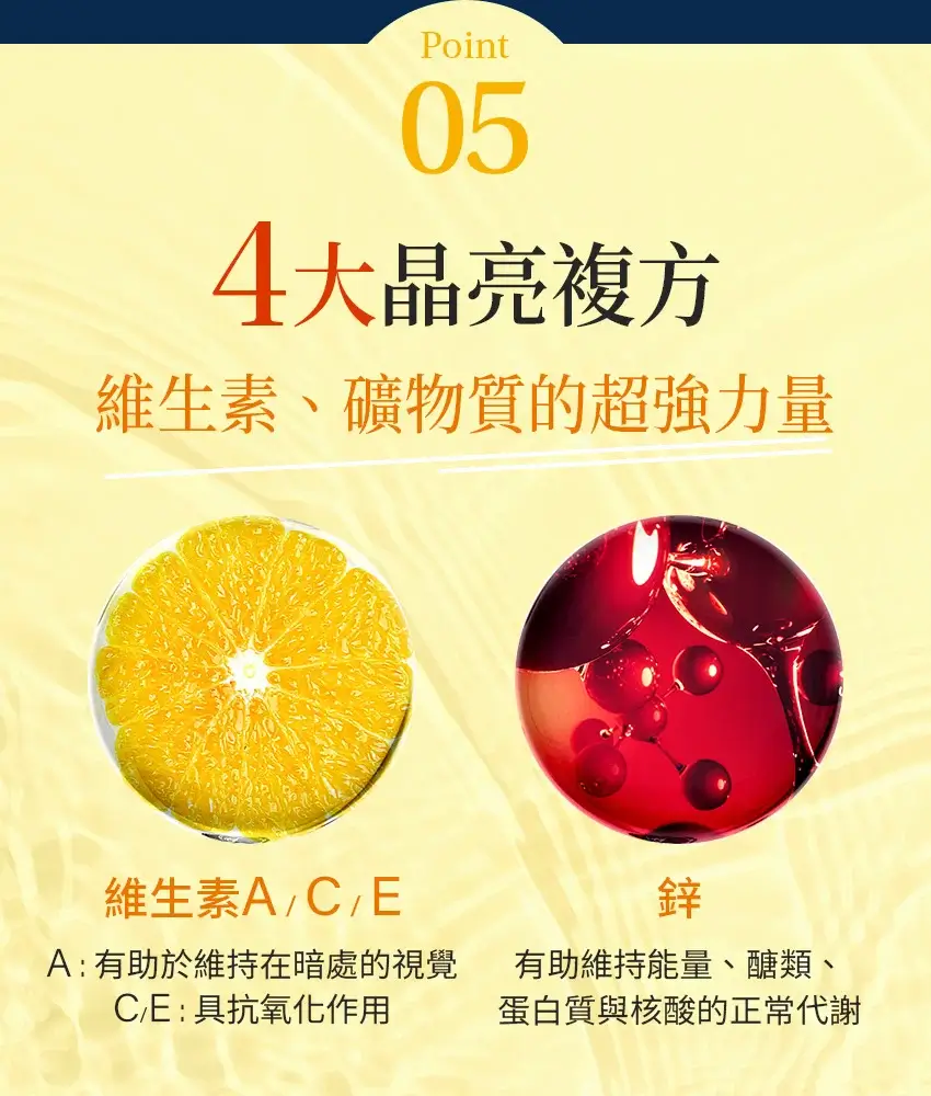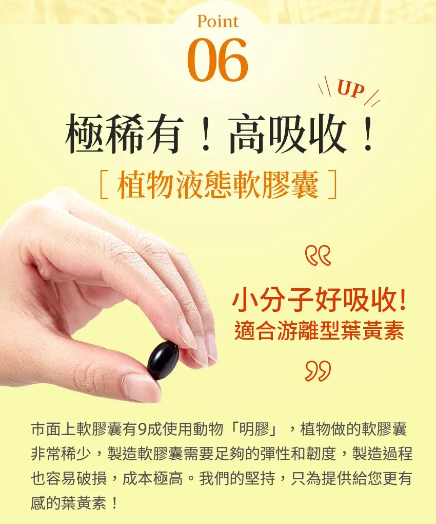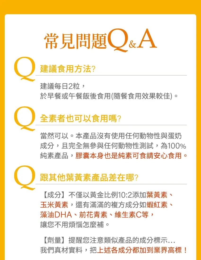 ◆成分:棕櫚油、柑橘油、乳化劑(山梨醇酐月桂酸酯聚氧乙烯醚)、金盞花萃取物(含葉黃素)、AstaZine® 專利紅藻萃取物(含蝦紅素)、輔酵素 Q10。